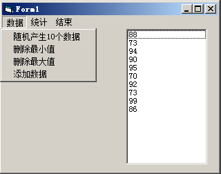 VB程序题:设计一个如图G.8所示的程序。它对列表框具有随机产生10个数据、删除最小值/最大值、添加数据、统计的功能。统计结果显示在如图G.9所示的窗体中。
